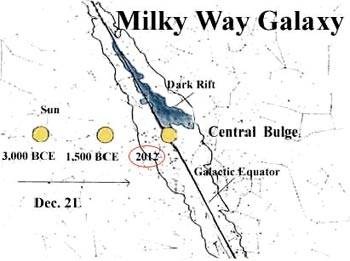 Д. М.: Никакого «парада планет» в 2012-м не будет, а что означает «Земля посреди Млечного пути», я вообще не понимаю. Если подразумевается галактика Млечный путь, — которая, кстати, имеет спиралевидную структуру, — то мы с нашей солнечной системой скорее у её края, то есть примерно в 30 тыс. световых лет от «посреди». Более того, мы вращаемся вокруг галактического центра и постоянно находимся примерно на одном и том же расстоянии от него.
