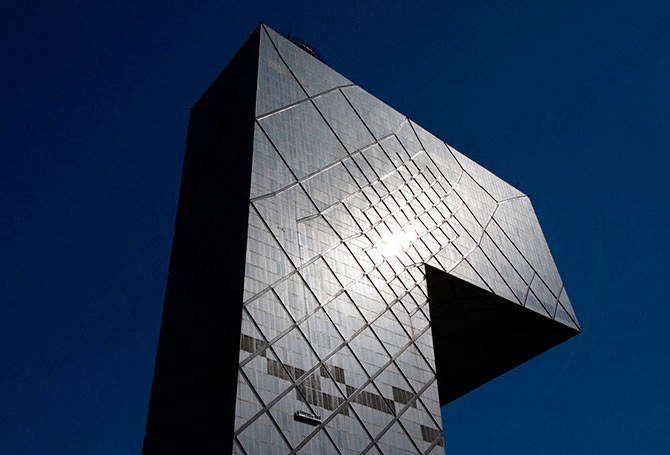 Огромное здание Центрального телевидения Китая в центре Пекина. Обратите вниманиена крошечную платформу мойщиков окон.