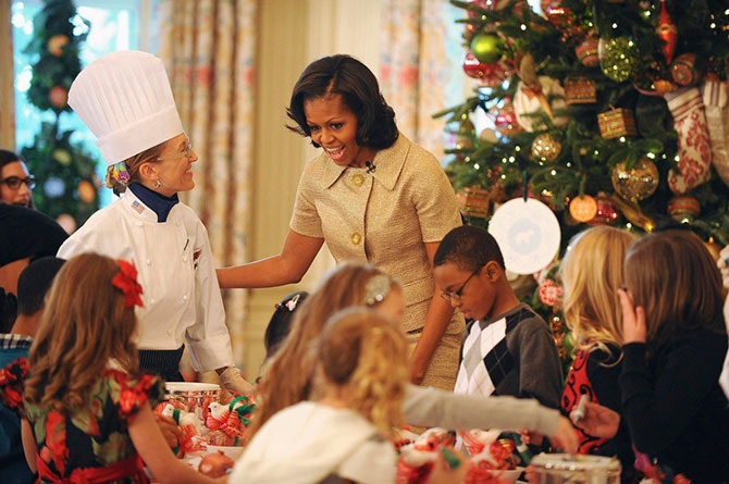 Первая леди США Мишель Обама пробует леденец во время традиционной экскурсии для детей военнослужащих в Белом доме, Вашингтон, округ Колумбия, США.