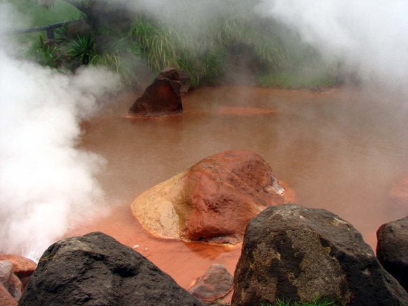 Это священные горячие источники на острове Кюсю, называют так же «Адом Беппу». Источников всего девять, и у каждого «ада» есть свое имя: голубого цвета – Морской Ад (глубина 120 метров, температура воды 90С), Чиноики Жигоку, или Кровавый пруд (от большого количества железа, вода здесь приобрела красный цвет), источник �Бритая голова� (просто булькающая теплая грязь), Белый пруд (кипящая вода здесь – молочного цвета из-за переизбытка кальция), Адская гора – вулкан, извергающий горячую грязь, «Адский котел».