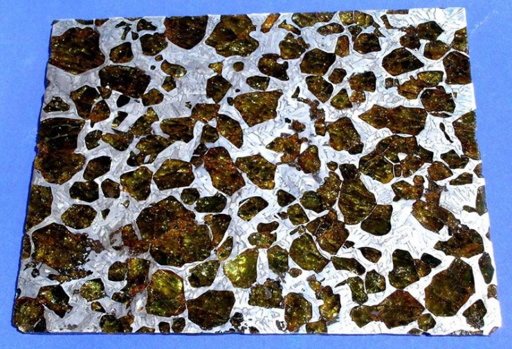Железный метеорит, с поразительными вкраплениями кристаллов оливина, весит 2,211 кг. Такие вкрапления отмечаются всего в 1% из всех находимых метеоритов на поверхности Земли.