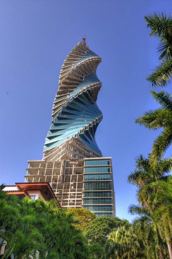 245-метровая железобетонная башня состоит из 52 этажей. Спираль делает полный оборот в 360 градусов к своей вершине.
