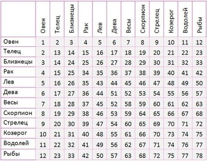Находим свой знак, находим знак любимого (любимой) и запоминаем цифру!