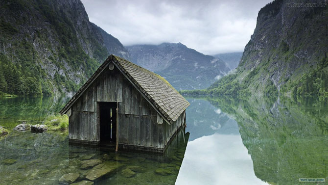 В единственном высокогорном национальном парке Германии «Берхтесгаден», охватывающем территорию свыше 210-ти км2 и входящем в наследие ЮНЕСКО, посреди озера «притаилась» хлипкая рыбацкая хижина. Она настолько органично вписывается в местный девственный природный пейзаж, что трудно представить, что этот домик был создан руками человека.