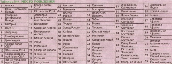 Место Вашего рождения В правой колонке Таблицы 3 находим свой символ, а в столбиках по центру (под стрелочками) дату своего рождения В одной строке с датой рождения, слева, в двух крайних колонках указано ЧИСЛО ВАШЕГО МЕСТА РОЖДЕНИЯ. Учитывайте Ваш пол в прошлой жизни. (Расшифровку см. в таблице 4) Например: Ваш СИМВОЛ — круг с квадратом врутри Число рождения — 17 Вы женщина Значит Ваше число места рождения — 64 В прошлой жизни Вы родились в центральной Индии Таблица 3