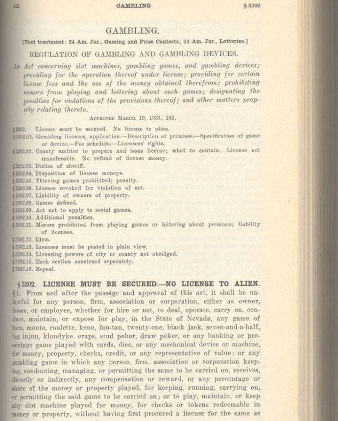 19 мая 1931 года на территории штата Невада азартные игры были вновь разрешены. Весь законопроект уместился всего на 6 страницах. Сегодня игровая индустрия регулируется десятками тысяч страниц местных и федеральных нормативных актов.