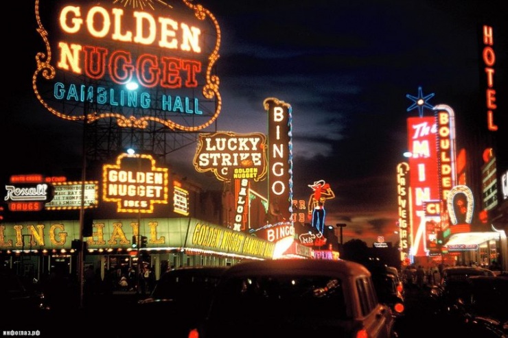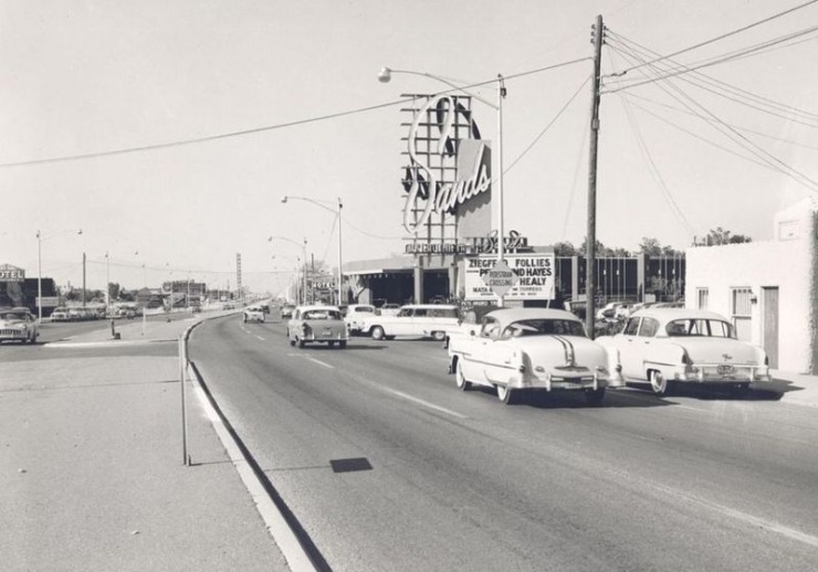 Данная фотография была сделана осенью 1954 года. Лас-Вегас-Стрип тогда был ещё не очень внушительным. Одно и двухэтажные здания ещё не передают сегодняшнее великолепие бульвара. Кстати, неоновые вывески уже тогда довольно часто использовались.