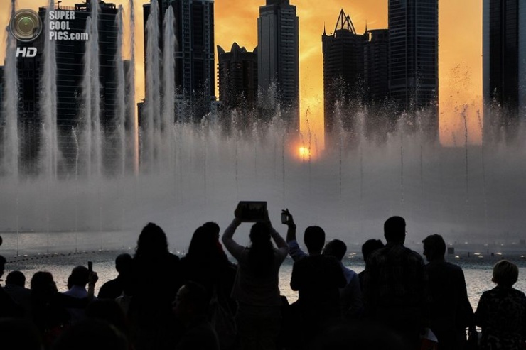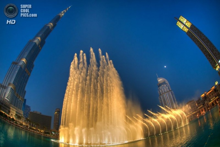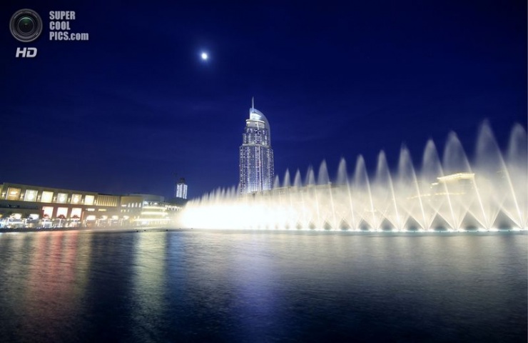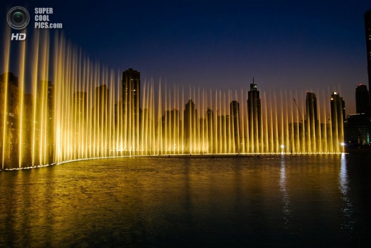 Самый большой музыкальный фонтан в мире находится в искусственном озере у небоскреба «Бурдж-Халифа», Дубай. Длина фонтана составляет 275 метров, высота выброса воды — 150 метров. Струи воды подсвечиваются 25 цветными и 6 600 точечными прожекторами. Грандиозное шоу проходит ежедневно каждые 30 минут с 18:00 до 22:00 по будням и с 18:00 до 23:00 по выходным. На строительство фонтана было потрачено $218 млн.