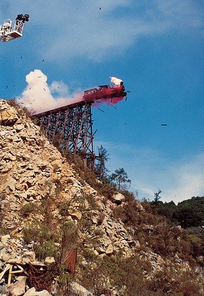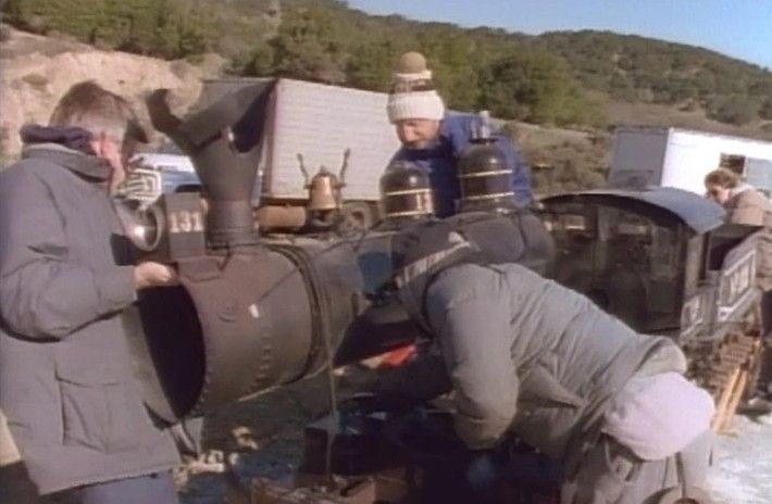 С технической точки зрения самым тяжелым в «Назад в будущее 3» был эпизод с поездом. Во-первых, многие трюки выполнялись на большой скорости и были опасны для жизни актеров. Во-вторых, съемочной группе надо было во что бы то ни стало сбросить древний паровоз с недостроенных рельсов. Сделать это с настоящим поездом было нереально, поэтому Роберт Земекис прибег к проверенному приему — снял уменьшенную копию локомотива. Над макетом работали около двух месяцев, а потом начинили его взрывчаткой, разогнали по специально для него построенным рельсам и уничтожили за пару секунд.