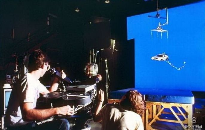 А вот летающие машины в сцене, когда Марти выходит в город будущего, добавляли послойно, прямо как в Photoshop: сначала детально прорабатывалась траектория одного автомобиля, потом другого и т. д. В конце концов все макеты были сняты на синем фоне, как того требовал Роберт Земекис, и «склеивались» с натурными кадрами.