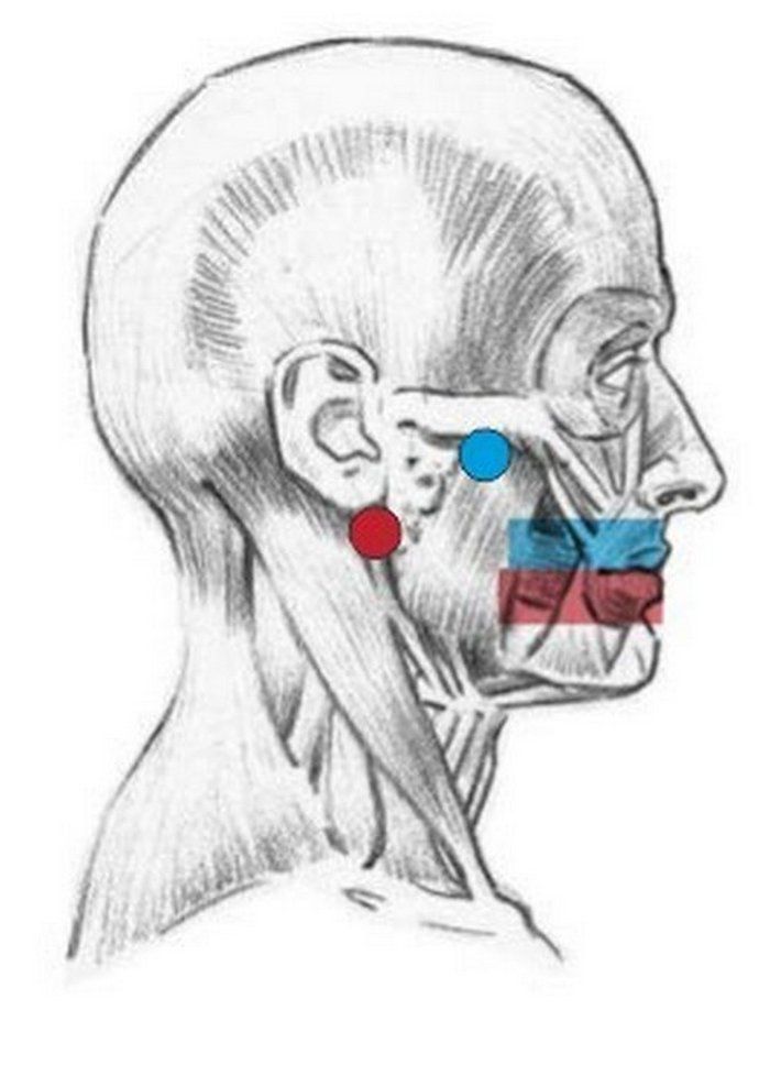 Голубой кружок — примерно там ищите нерв верхних зубов.