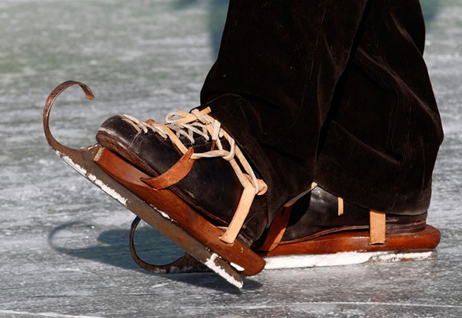 С 13 века коньки служили человеку средством передвижения по замерзшим рекам, озерам и каналам в северных странах. Уже тогда в Голландии начали делать коньки, состоящие из деревянной основы, в которую вставлялись металлические полоски. Такие коньки ремнями крепились к обуви. На фото: коньки того времени в современном исполнении.