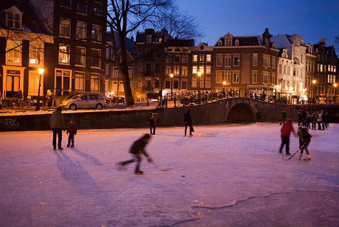 А вот так уже современные голландцы катаются и играют в хоккей на замерзших каналах Амстердама, продолжая традиции своих далеких предков. Как будто и не прошло с тех пор уже 400 лет!