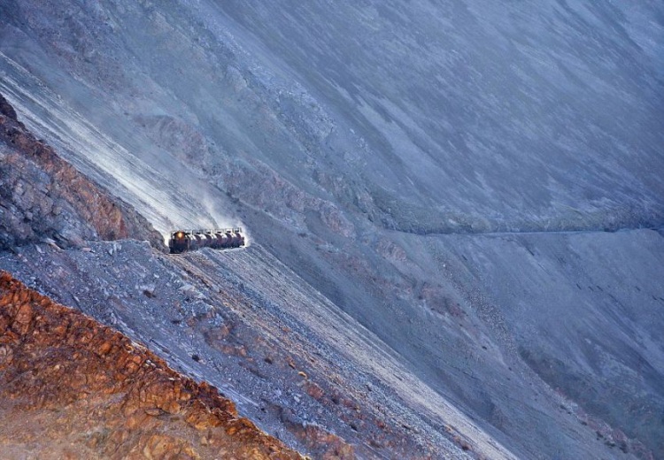 Опасный бизнес: Поезд направляется вниз по склону от медеплавильного завода Потрериллос с цистернами серной кислоты.