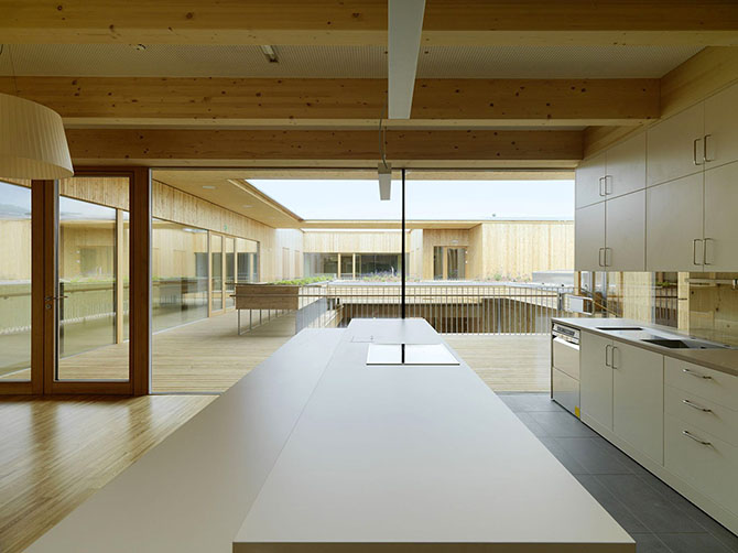 Каждый жилой блок представлен отдельными номерами, общей кухней и столовой, в которых создана по-домашнему уютная атмосфера. Большие балконы и лоджии, а также многочисленные тропинки, проложенные на территории Peter Rosegger, предлагают разнообразные места для отдыха. Каждый блок оформлен в отличной от других цветовой гамме, чтобы легче ориентироваться. Комнаты персонала стратегически спроектированы в центральной части здания, что подразумевает быстрый доступ в любой из блоков.