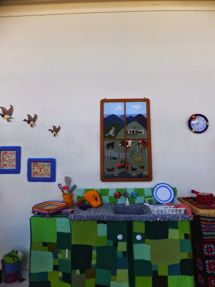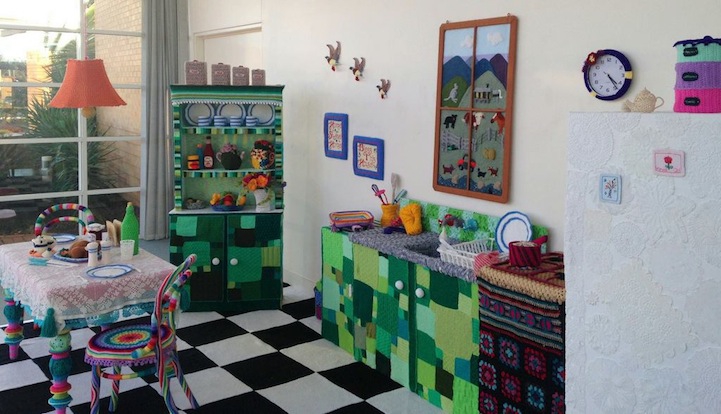 50 художников и мастеров семь месяцев работали над необычным проектом — создавали вязаную кухню. Вся мебель, бытовые предметы и элементы декора покрыты разноцветной пряжей: от солонки до холодильника. Даже вместо воды из крана «струится» пряжа. Столь необычная инсталляция представлена в Художественной галерее Варвика, Англия.