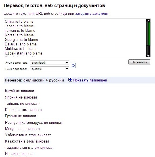Интернет-пользователи нашли курьезный сбой в одном из сервисов портала Google. Как выяснилось, если в переводчик вставить фразу на английском USA is to blame или Obama is to blame («США виноваты», «Обама виноват»), результат на русском языке появлялся противоположный: «США не виноваты, Обама не виноват».