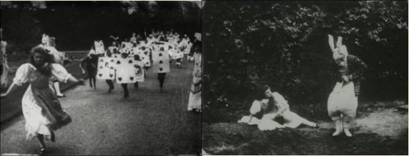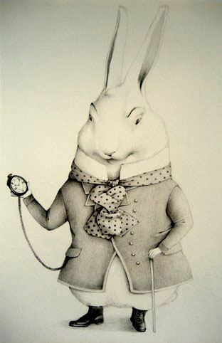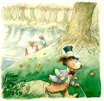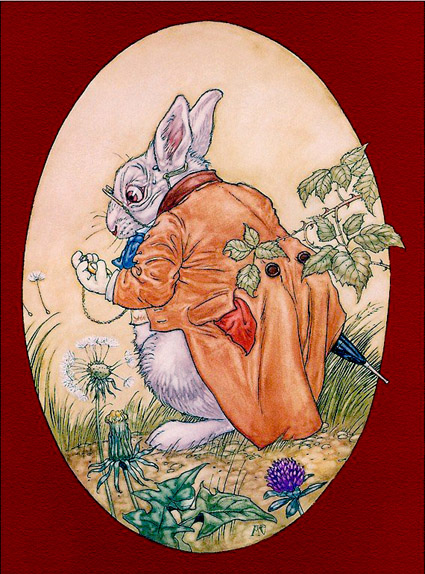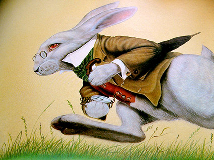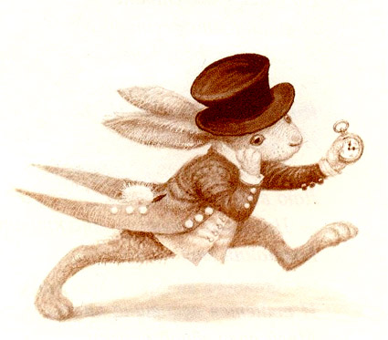 Поначалу Алисе не кажется это особенно странным и только когда кролик вынимает часы из жилетного кармана и, посмотрев на них, убегает дальше, Алиса в изумлении вскакивает на ноги и бежит за ним, ныряя в кроличью нору, с которой и начинается погружение Алисы в удивительный мир Страны Чудес.