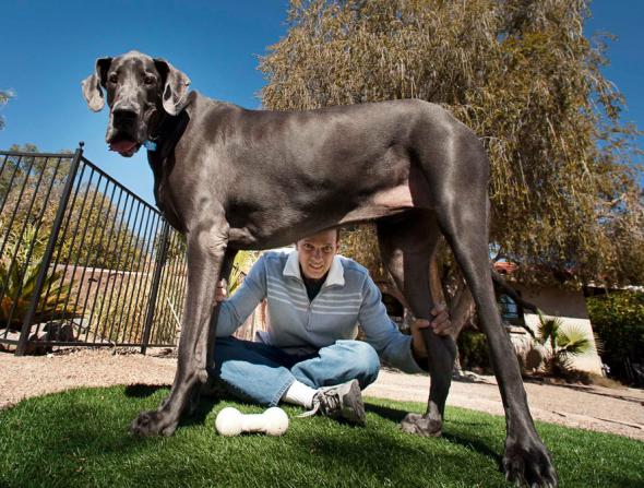 Рост датского дога по кличке Гигант Джордж составляет 1,07 метров от лапы до плеча, что на три четвертых сантиметра выше его ближайшего соперника на рекорд в книге Гиннеса – белого датского дога Титана из Сан-Диего. Под собакой сидит ее хозяин Дэвид Нассер. (AP Photo/Guinness World Records,Jacob Chinn)