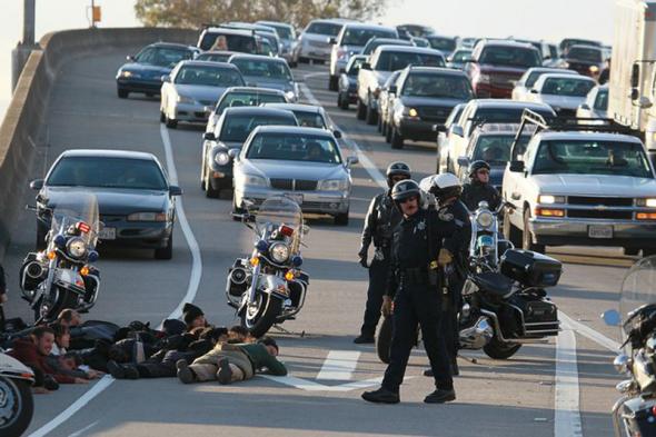 Демонстранты на шоссе 880 после того, как их арестовала полиция Окленда за попытку блокировать движение. Демонстранты выступали против урезки образовательных фондов и повышения платы за обучение. После попытки блокировать шоссе 880 десятки демонстрантов были арестованы. (Justin Sullivan)
