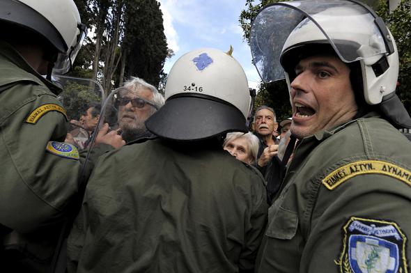 Демонстранты пытаются прорваться через блокаду полицейских к штаб-квартире премьер-министра в Афинах. Кабинет министров Греции принял жестокие меры по преодолению дефицита бюджета, согласно которым будут сокращены выплаты гражданским служащим, а налог с продаж выростет до 21%. (Louisa Gouliamaki/Agence France-Presse/Getty Images)