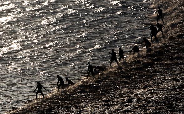 Серферы готовятся оседлать приливный вал — феномен, появляющийся приблизительно в день весеннего и осеннего равноденствия, — на реке Северн в Глостершире. (Matt Cardy/Getty Images)