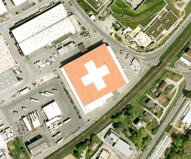 Google mapПолноэкранный режим Флаг Швейцарии На западе швейцарского городка Морж можно увидеть крупнейший швейцарский флаг в мире. Речь идет о 80 метрах площади. Флаг нарисован на крыше офисного здания.