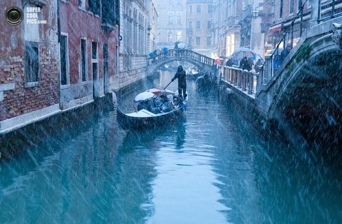 Первое в этом году наводнение в Венеции вызвал снегопад, уровень воду повысился на полтора метра, в результате чего был затоплен исторический центр.Ситуация ухудшается еще и низкой температурой. Туристы вынуждены покинуть город, им такая обстановка не по душе. Туристы под зонтиками и плащами катаются на гондоле во время сильного снегопада, Венеция, Италия.