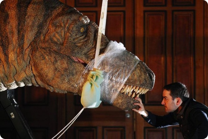 Менеджер выставки Пол Галлахер осматривает аниматронную модель тарбозавра на новой выставке музея естествознания в Лондоне. Интерактивная выставка под названием «Эра динозавров» должна оживить лагуны Юрского периода и пустыни мелового периода 65 миллионов лет назад.