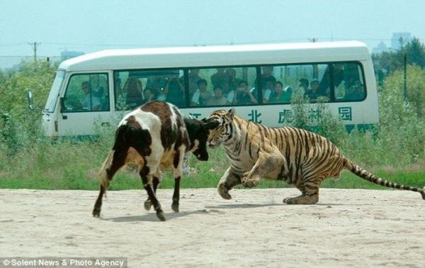 Несомненно, что это событие ожидалось, потому что группа из пяти тигров сразу же появилась из зарослей». Хищникам тут же бросили живых кур и фазана, и они быстро с ними разделались. То что случилось дальше,