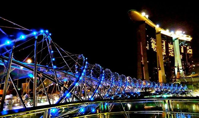 Этот мост уникален тем, что похож на структуру ДНК. Открытый в 2010 году, Хеликс-Бридж сделан главным образом из стали и освещен ночью лентами светодиодного освещения, чтобы подчеркнуть его уникальный дизайн.