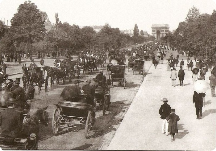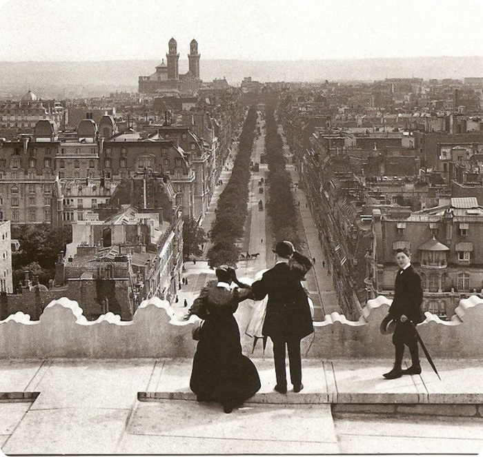 19. Вид с Триумфальной Арки на Авеню Клебер, 1900 год. Она возвышается. Точно на прямой, которая связывает Лувр с большой Аркой Дефанс, Триумфальная Арка возвышается над Елисейскими Полями и оберегает огонь на могиле неизвестного солдата.