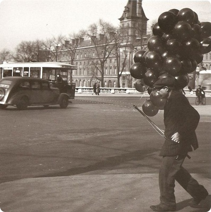 26. Продавец шаров на площади Сен-Мишель. Эти воздушные шары ожидают детей, чтобы подняться в воздух над Сеной, с левого берега, перед площадью Сен-Мишель (1938 год).