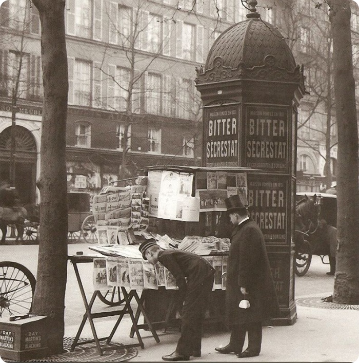 16. Торговля в газетном киоске. Газеты, журналы и сводки продаются в газетных киосках, этих маленьких городских храмах, оборудованных на тротуарах, и запираемых на ночь створками (у вокзала Св. Лазаря, 1899 год).