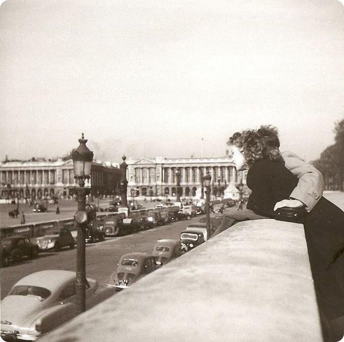 23. Влюбленная пара. Влюбленные в саду Тюильри наблюдают за маневрами автомобилей на площади Согласия, март 1952 года.