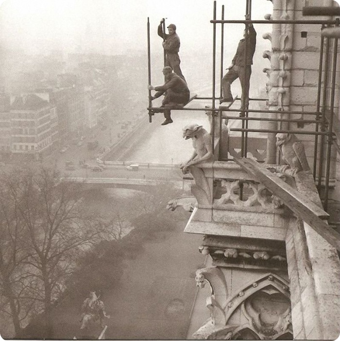 22. Установка строительных лесов на Нотр-Даме. Париж 1952 год, головокружительный вид для троих рабочих, которые оградили гаргулий, чтобы закрепить строительные леса.