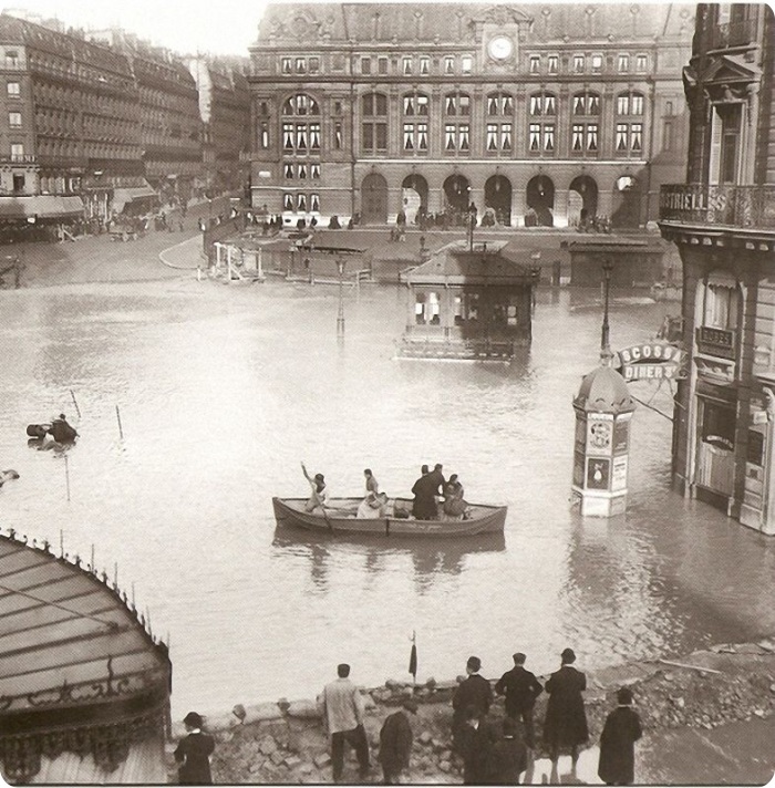20. Разлив Сены перед вокзалом Св. Лазаря, 1910 год. В 1910 году столица пострадала от наводнения, парижане передвигались на лодках. 28 января уровень воды достиг 8,62 м и возвращался к прежнему уровню 35 дней.