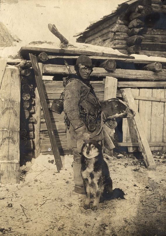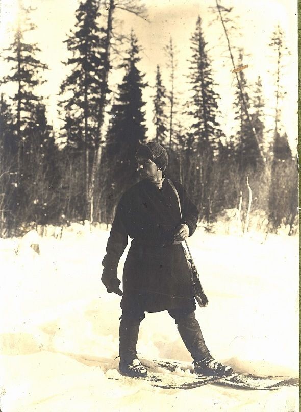 Охотник стоит на широких коротких лыжах, крепящихся к ступне ремешками. На таких лыжах ходили без палок.