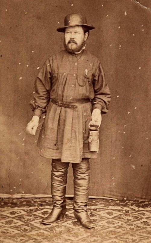 Мужской костюм, запечатленный на снимке, весьма своеобразен: смесь городской и так называемой приисковой моды. Рубашку подобного типа носили рабочие приисков и крестьяне, такой фасон использовался чаще для выходной одежды. Сапоги с высоким каблуком и тупым носом являлись модной обувью в 18801890-е гг. Шляпа и часы на шейном шнуре или цепи предметы городской роскоши, добавляли костюму своеобразие и приисковый шарм.