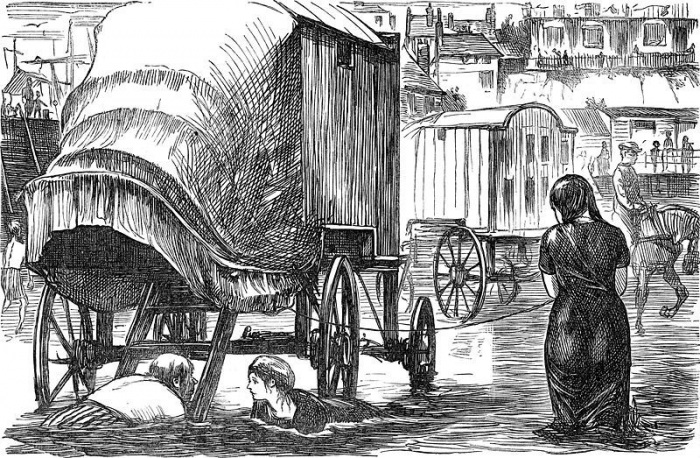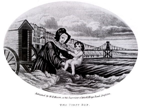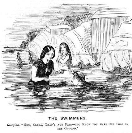 «Rather Fresh», a print produced by Rock & Co. of London, showing young ladies bathing at Brighton in the 1850s.