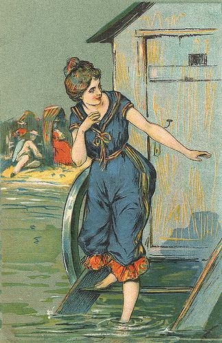 In the early Victorian era women had worn serge or dark flannel bathing dresses, but by the 1860s two piece belted costumes replaced the earlier styles.