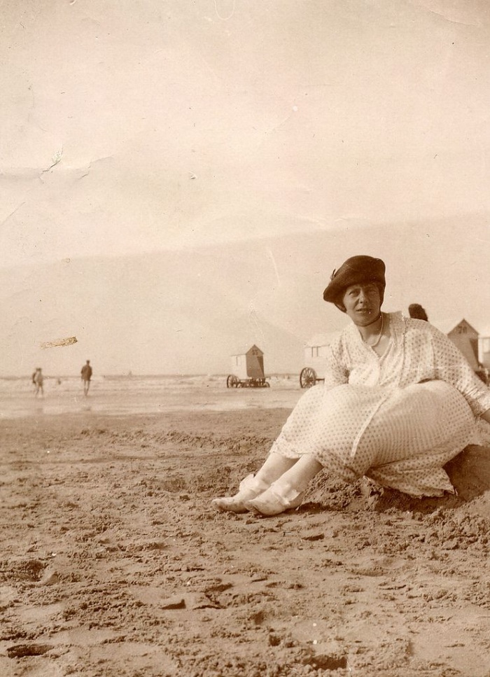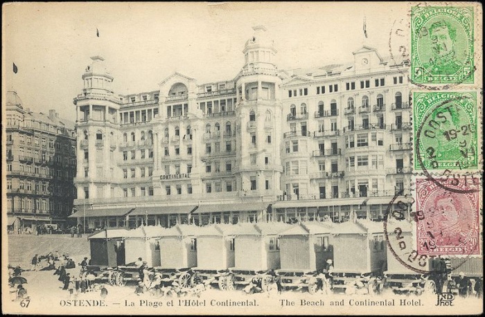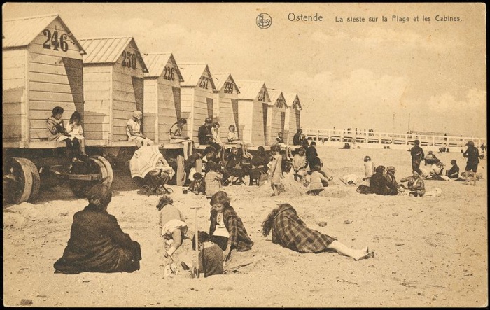 Oostende, the beach and the Kursaal, circa 1890. This gives us a good view of the infamous «Bathing Machines» in which women had to not only change into their bathing suits but also be carried into the water to avoid the indignity of having to walk across the beach in their bathing suits.