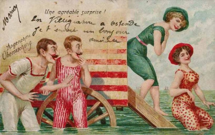 Vintage postcard depicting male bathers ogling ladies as the emerge from a bathing machine