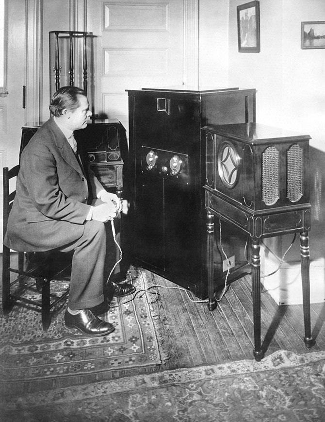 Доктор Александерссон перед своим аппаратом с трехдюймовым экраном, который способен передавать как звук, так и изображения, Нью-Йорк, 14 января 1928 год.Люди смотрят телевизор на станции Ватерлоо, Лондон, 1936 год.