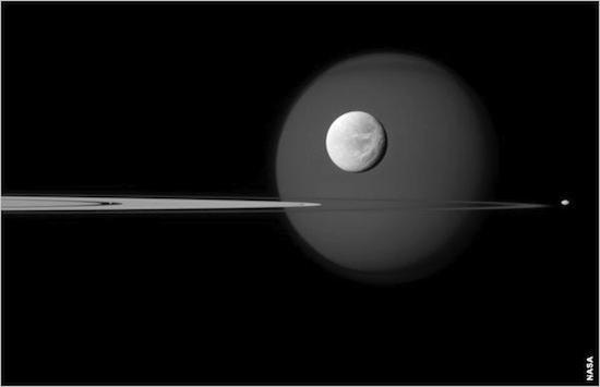 На этом снимке видны сразу четыре луны Сатурна: Титан, Диона, Пандора и Пан