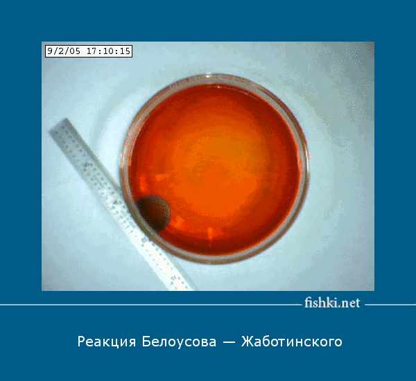 Реакция Белоусова — Жаботинского. Медленно распространяющиеся химические колебания, содержащие бром и кислоты.