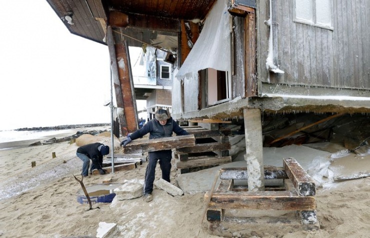 Том Ни укрепляет фундамент своего поврежденного дома после сильного шторма на Плам-Айленд в Ньюбери, штат Массачусетс, 9 февраля 2013 года.