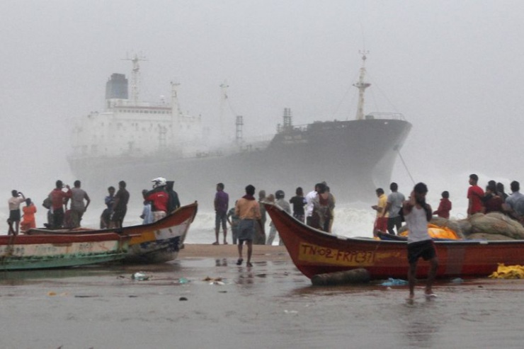 Люди собрались на пляже, во время того как нефтяной танкер Пратибха Кавери сел на мель в Ченнаи, Индия, 31 октября 2012 года.