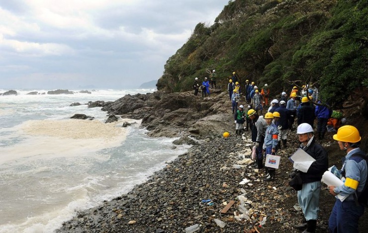 Рабочие изучают побережье возле АЭС Охи, префектура Фукуи, Япония, 2 ноября 2012 года.