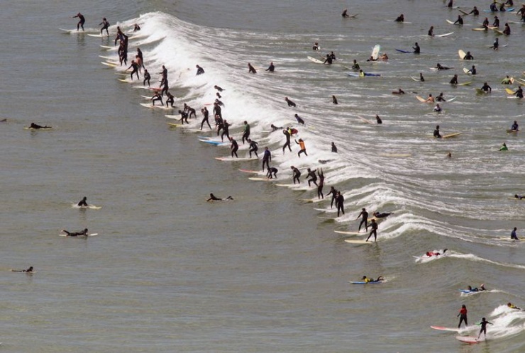 Серферы пытаются побить рекорд Гиннеса на наиболее количество серферов на волне в Майзенберге, Южная Африка, 30 сентября 2012 года.